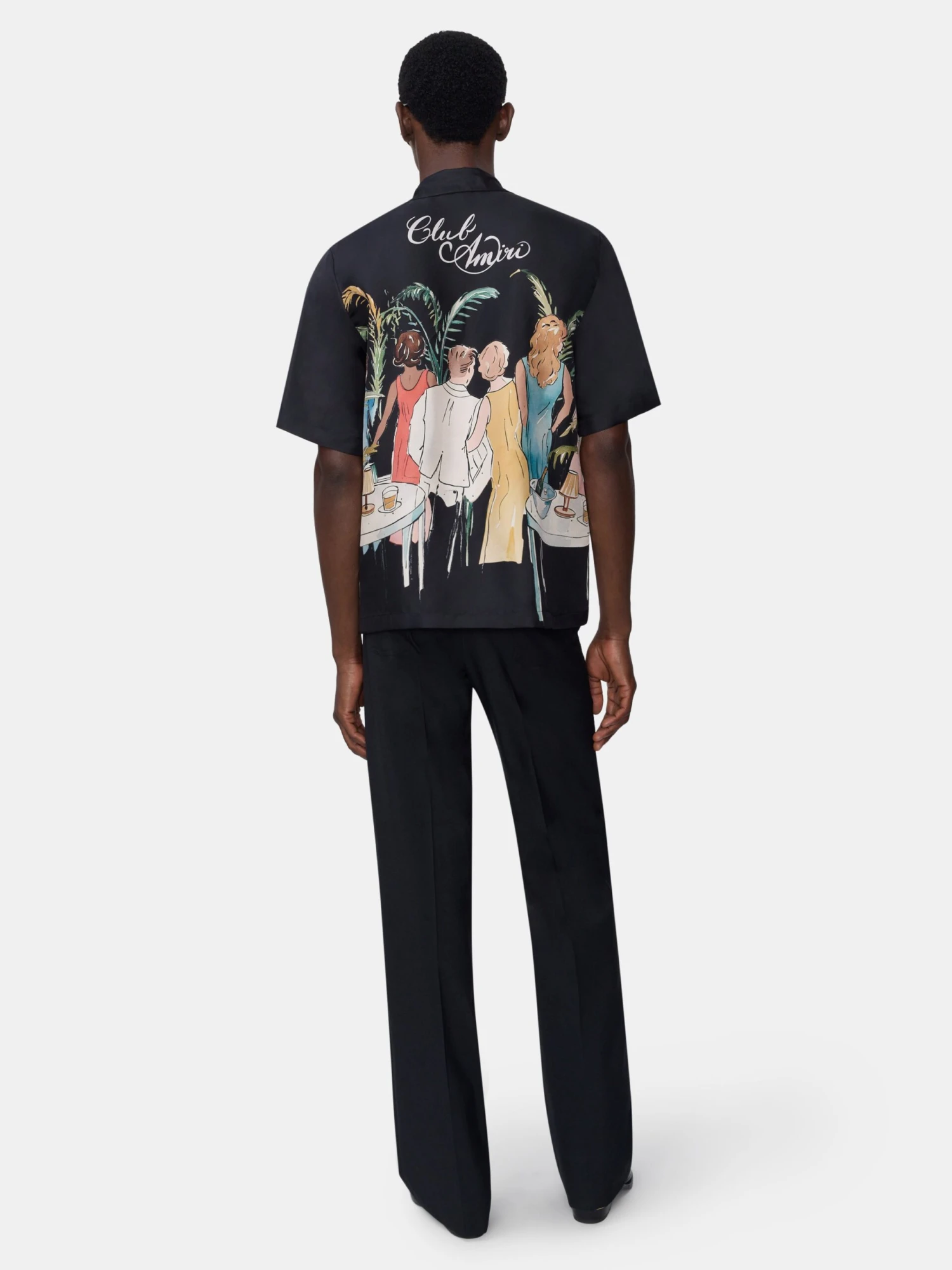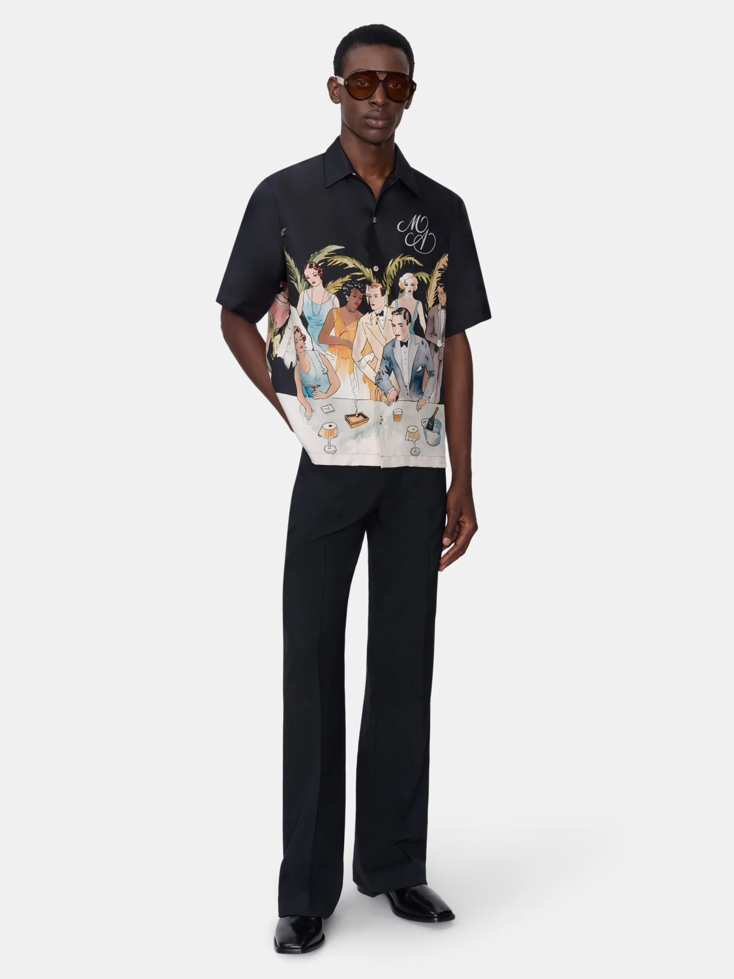 Autumn-Winter 2025 presents a cinematic reimagining of Hollywood nightlife, with a cast of larger-than-life characters. The Bar Scene Bowling Shirt in silk is finished with a notched collar and summary-down closure.