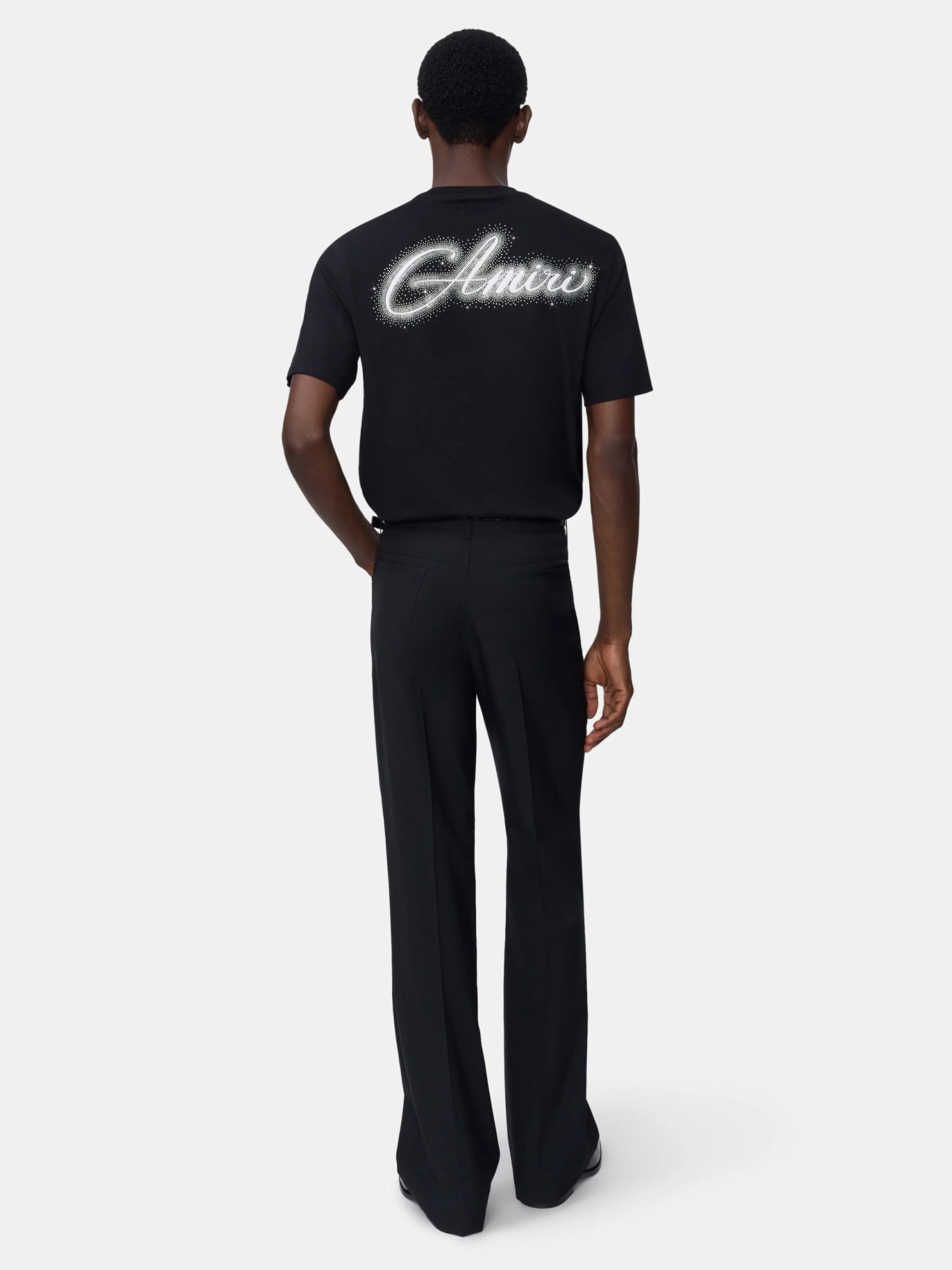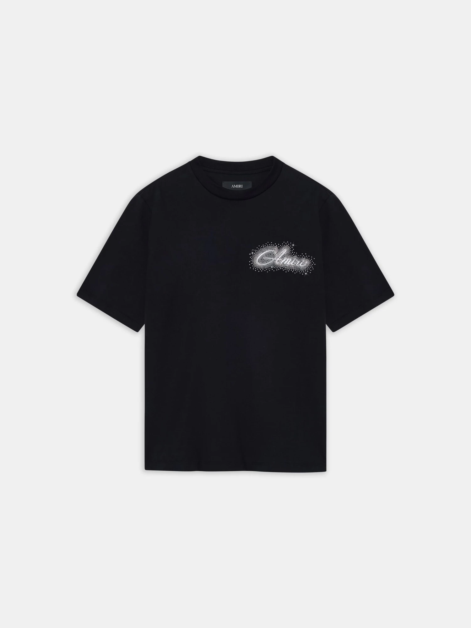 Light-catching crystals illuminate men’s jersey tees for Autumn-Winter 2025. The AMIRI Crystal Script in cotton is embellished with crystals depicting the script logo on front and back.