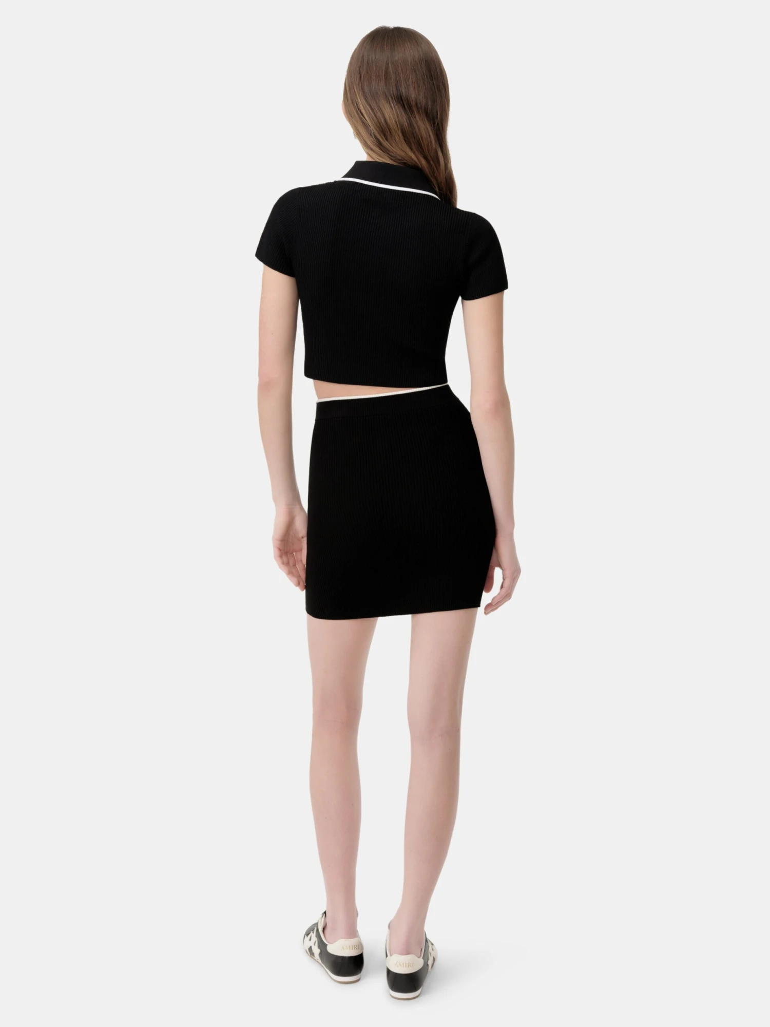 Pre-Fall 2025 womenswear continues to explore house signature motifs in novel interpretations. The MA Polo is designed in a rib knit and finished with three-summary closure, MA icon embroidery, and contrast tipping at the collar.