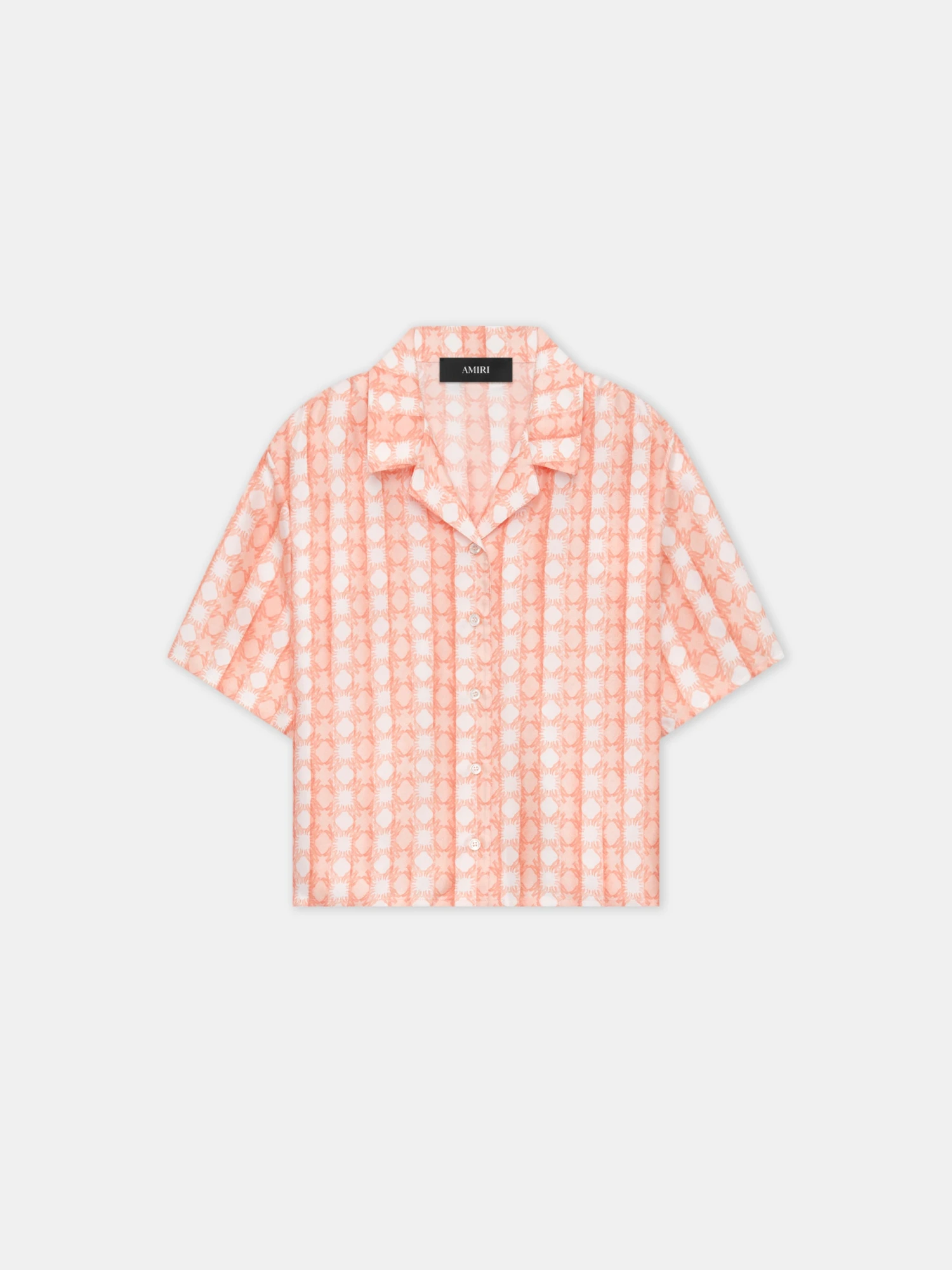 A watercolor rendition of the house’s MA Quad monogram print defines women’s shirts for Pre-Fall 2025. The MA Quad Shirt is designed in a relaxed fit and finished with a notched collar and summary-down closure.