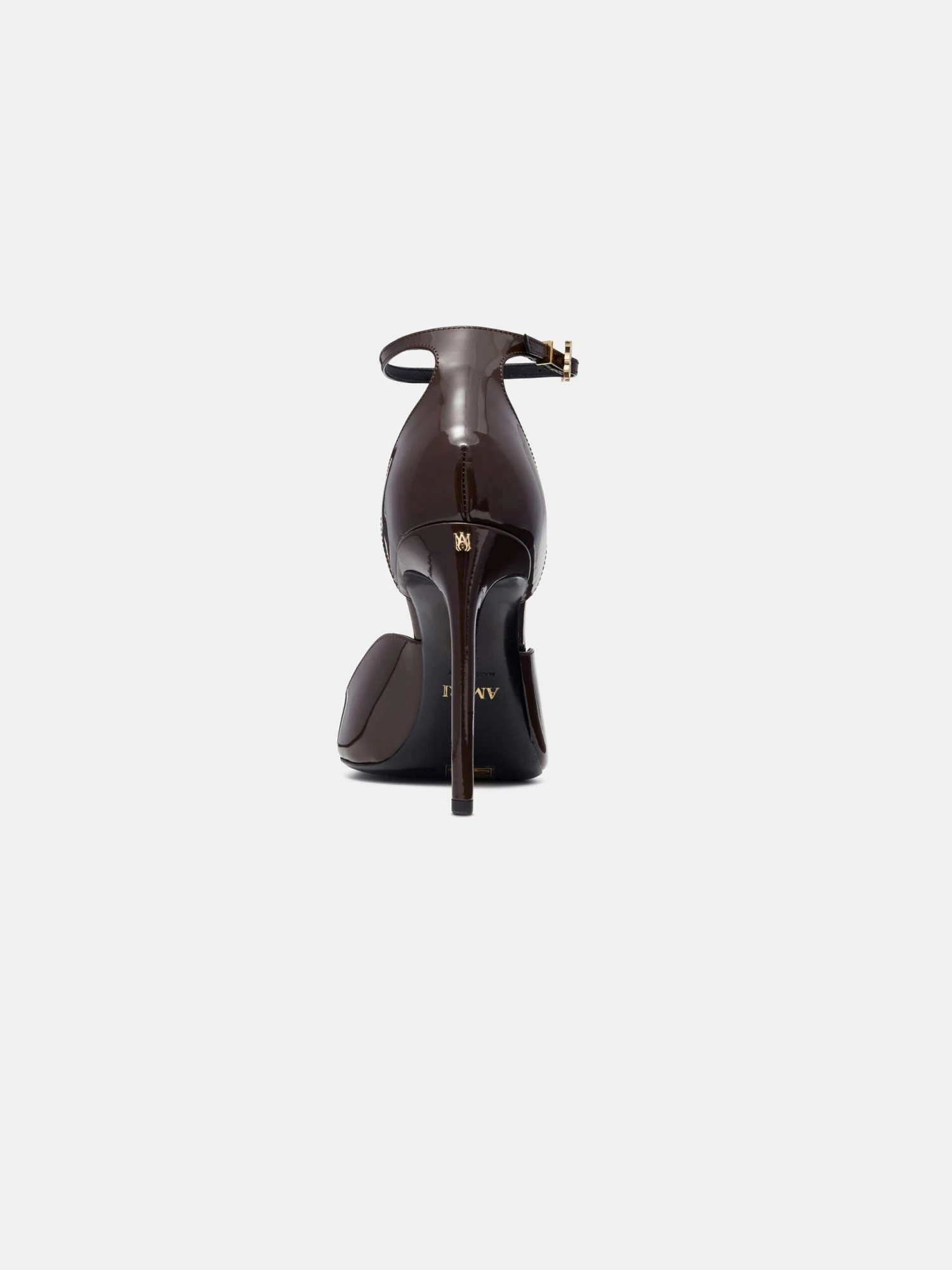 MA icon detailing defines a streamlined high heel silhouette for Autumn-Winter 2025. The MA Stiletto is crafted from patent leather and finished with an adjustable buckle ankle strap accented with custom MA hardware.