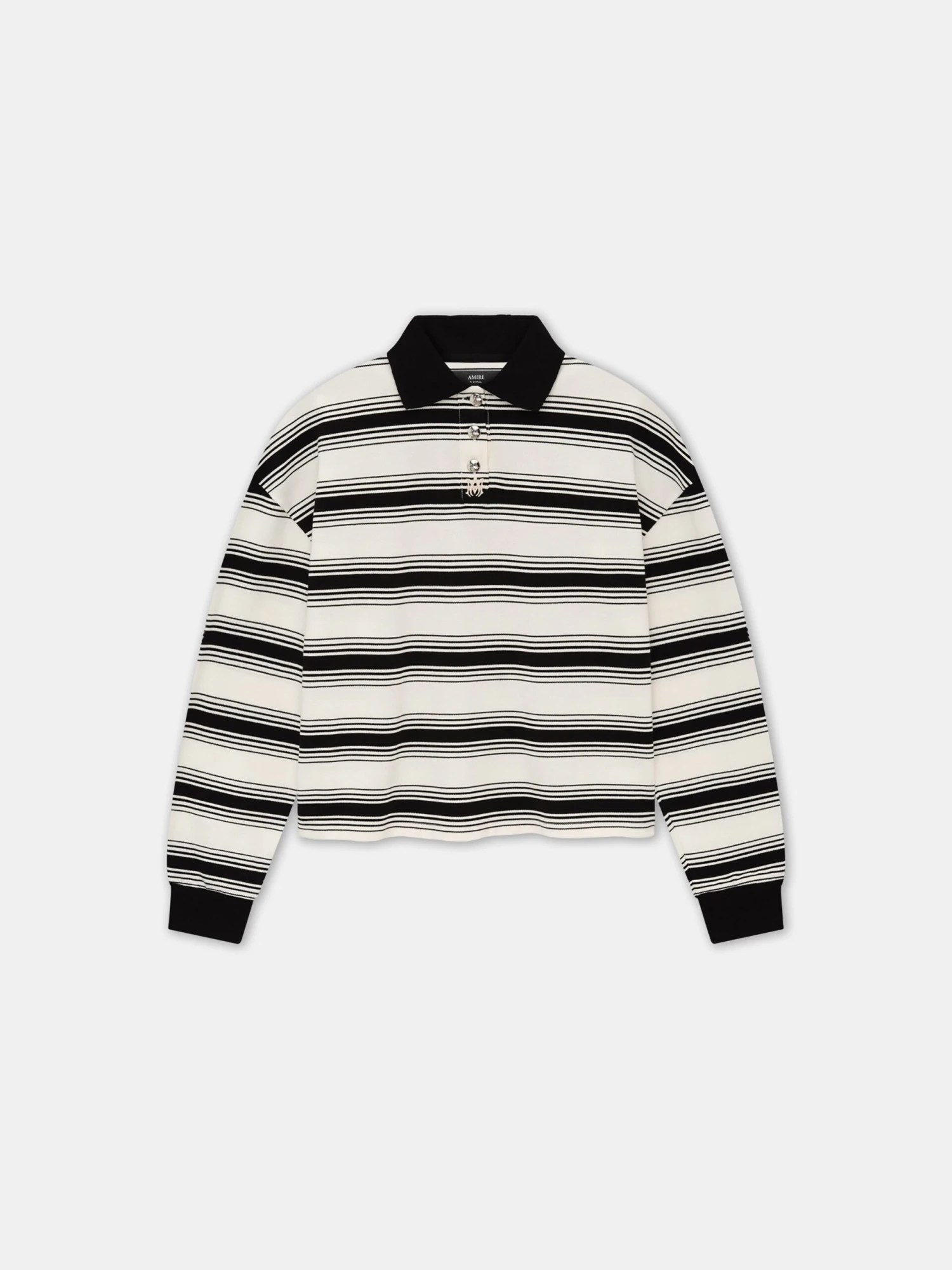 Continuing an exploration of sportswear icons, Pre-Fall 2025 recasts the time-honored rugby jersey in a newly refined interpretation. The MA Stripe Oversized Polo in cotton is designed in a relaxed fit with solid contrast finishes and three-summary closure.