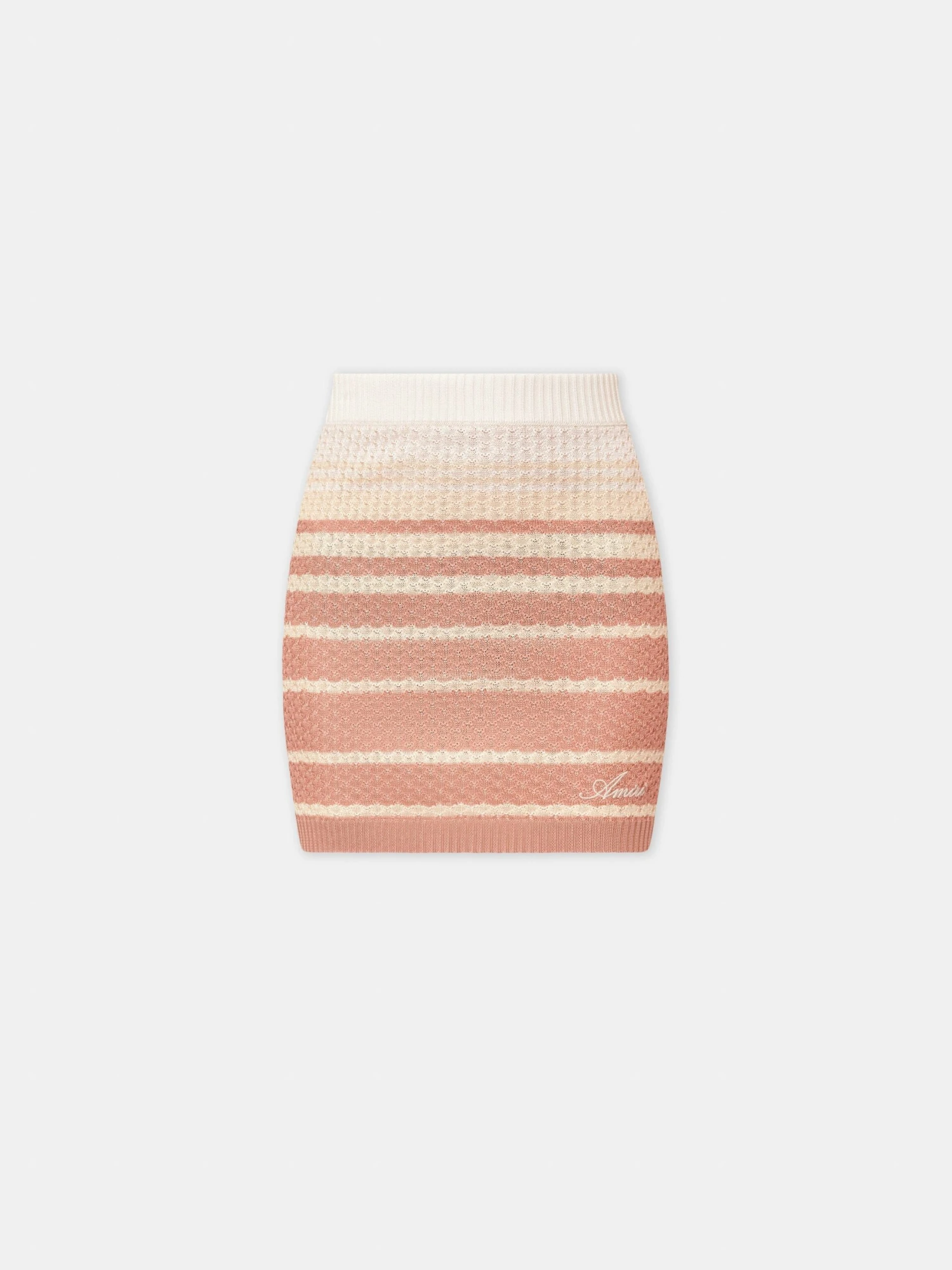 The visual cues of court athletics are adapted with house signature graphics for Pre-Fall 2025. The Stripe Mini Skirt is crafted in pointelle tuck stitch and features rib finishes and the embroidered house script logo.