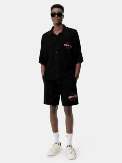 House signature graphics illustrate kids’ swimwear in seasonal colors for Pre-Fall 2025. The AMIRI Staggered Swim Trunk features a back pocket and an elastic waistband with drawcord.