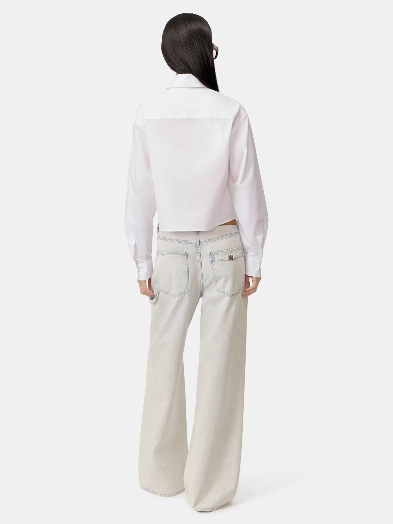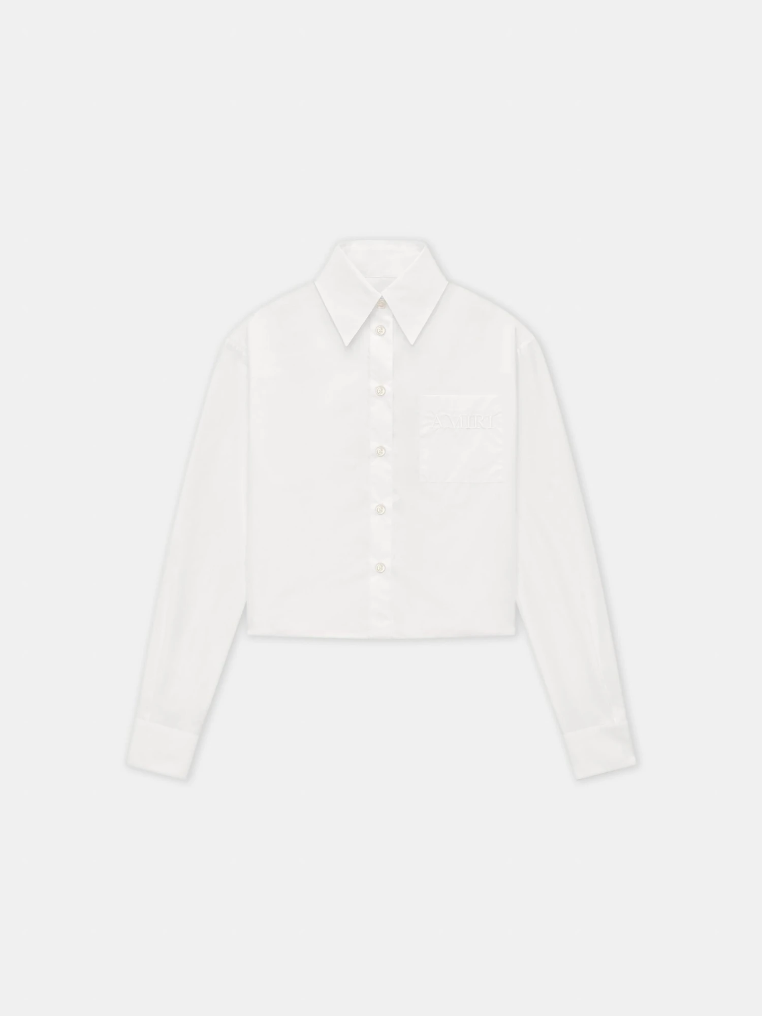 For Pre-Fall 2025 womenswear, classic shirting is illustrated with the house’s signature logo in monochrome embroidery. The AMIRI Poplin Shirt in cotton features a front pocket and summary-down closure.