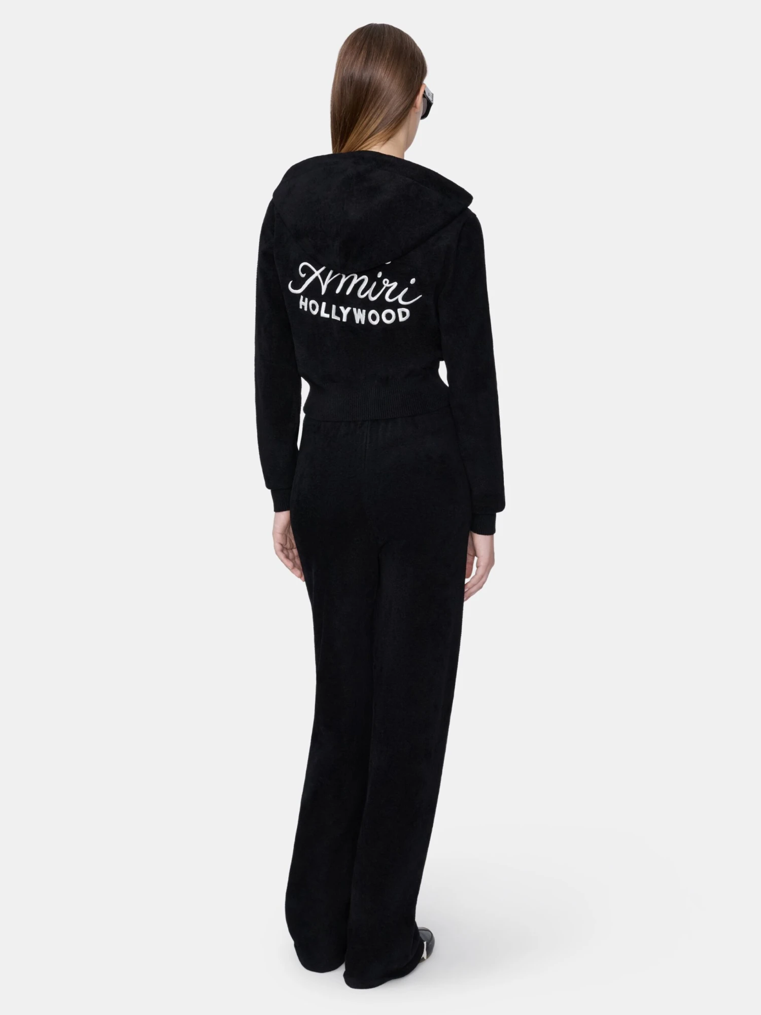 Autumn-Winter 2025 introduces new renditions of the house script logo. The Club AMIRI Cropped Hoodie is illustrated with seasonal logo embroidery and finished with drawcords, fine rib accents, and zip closure.